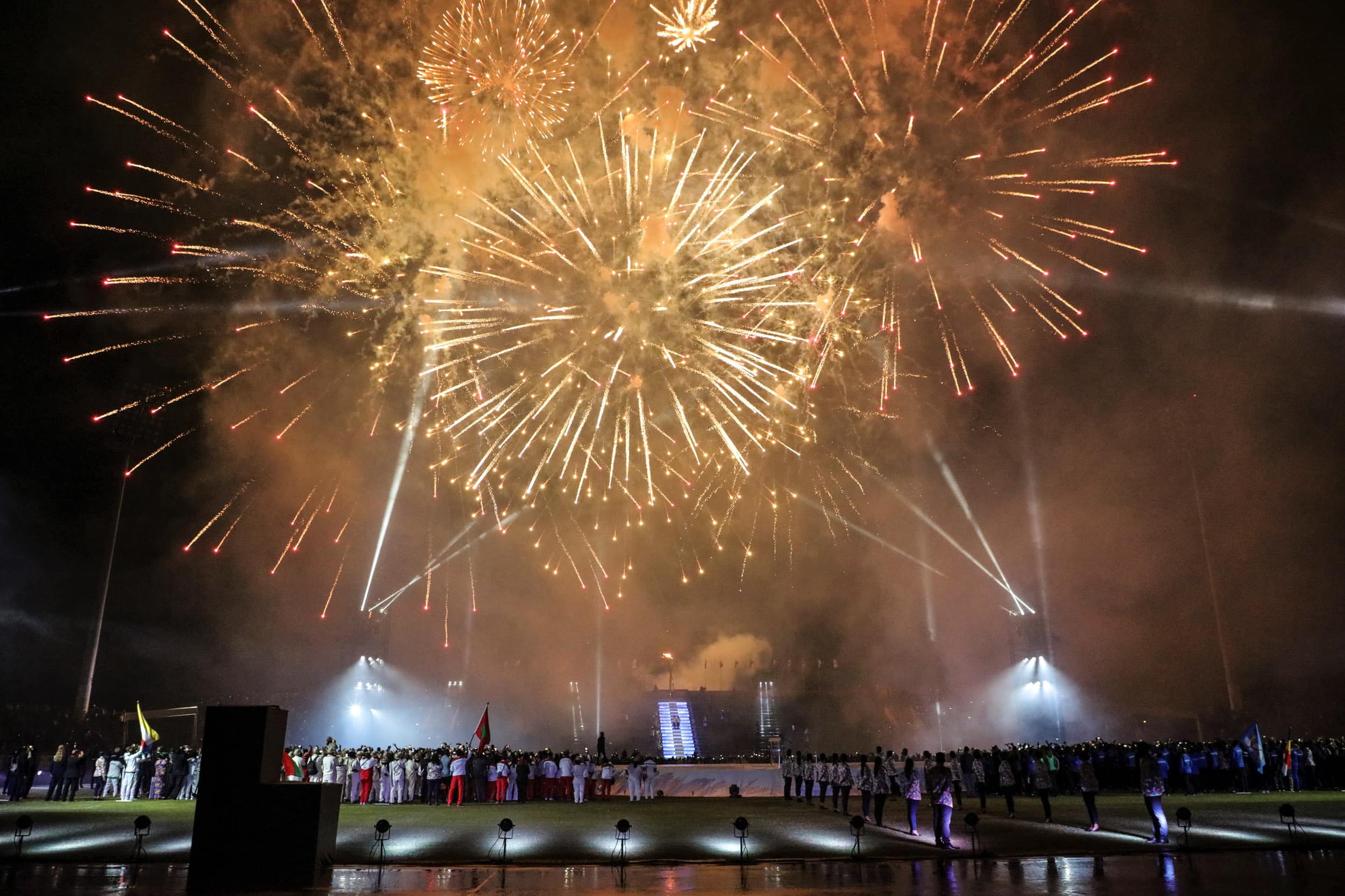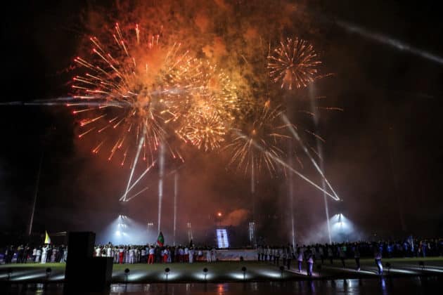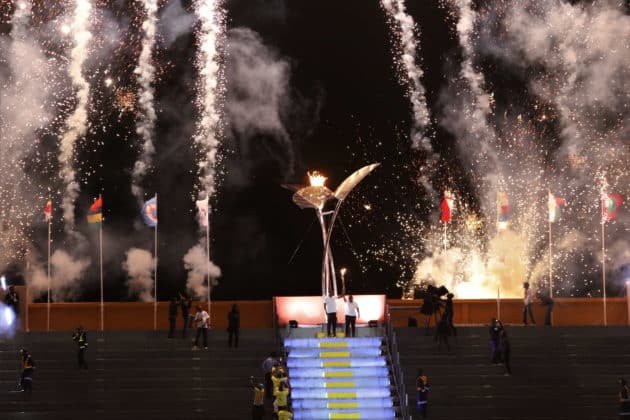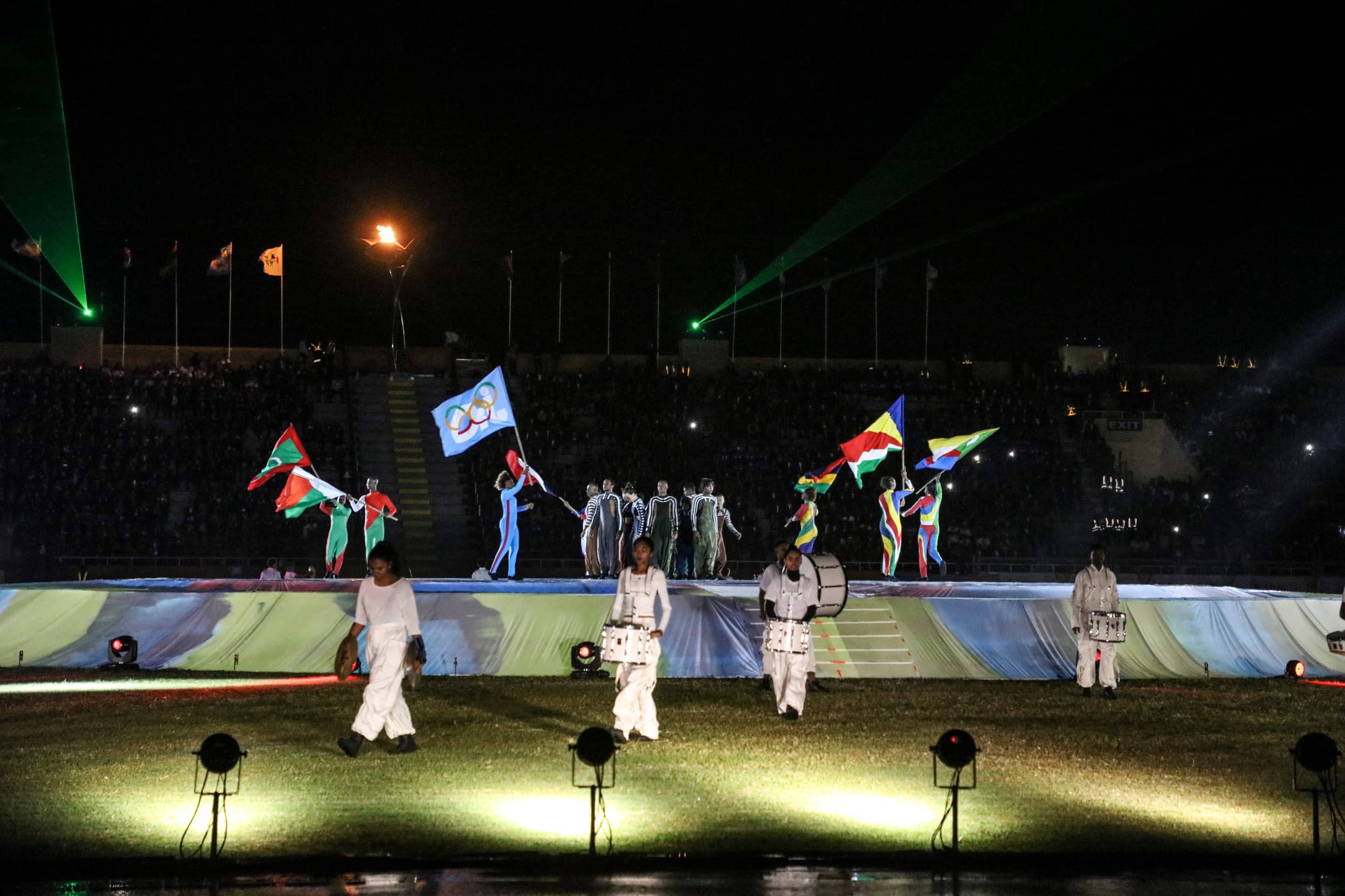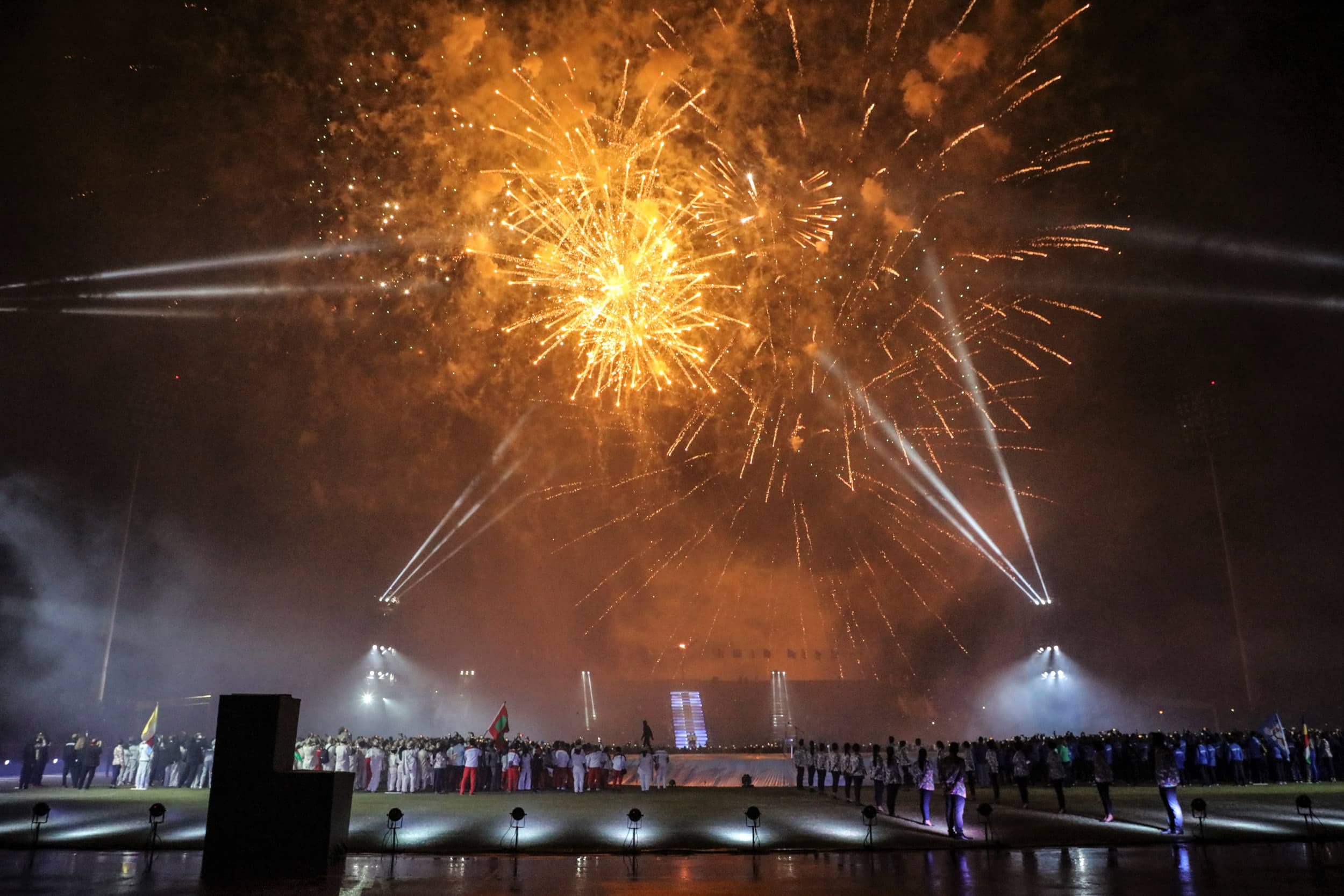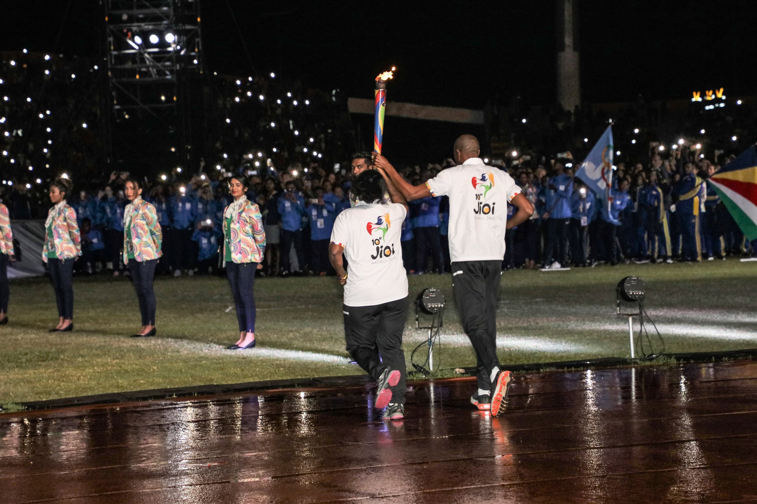 Les centaines d’athlètes réunis sur le pelouse d’Anjalay, ainsi que les quelque milliers de spectateurs présents pour cette cérémonie d’ouverture à guichets fermés, attendent désormais LA star de la soirée, à savoir la flamme des Jeux. Plus attrayante que les discours politiques interminables qui l’ont précédée, Dame Flamme embrase le stade comme prévu. Et un feu d’artifice vient ponctuer son arrivée en beauté. Les Jeux sont officiellement ouverts.