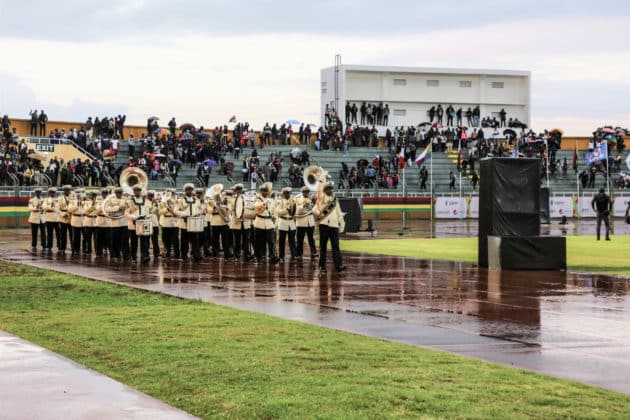 Dehors, l’impatience est elle aussi palpable dans le camp des acteurs. Ça trépigne, ça chante, ça crie… Le clan 974 est déjà installé depuis belle lurette à l’entrée du stade. Les basketteurs mettent l’ambiance. Les athlètes ne sont pas en reste. Juste devant, la fanfare de la police nationale a sorti ses habits du dimanche en ce vendredi à marquer d’une pierre quadricolore pour le sport mauricien. Mais à quelques instants d’entrer en scène, alors que l’hymne mauricien résonne dans le stade, une pluie glaçante vient casser le délire.