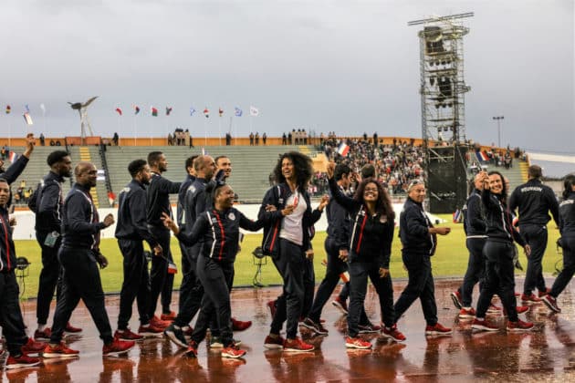 Dans les rangs de La Réunion, ça s’éparpille, façon puzzle. Et même les policiers mélomanes finissent par se carapater un à un, leur trombone sous le bras. La cérémonie d’ouverture est en train de partir en sucette. Les gradins se vident à leur tour et tout le monde scrute désormais le ciel en espérant une clémence divine. Dieu étant grand et l’averse pas tant que ça, la délégation 974 reforme les rangs, le brass band from Mauritius aussi et la véritable cérémonie peut enfin démarrer. Halleluia !