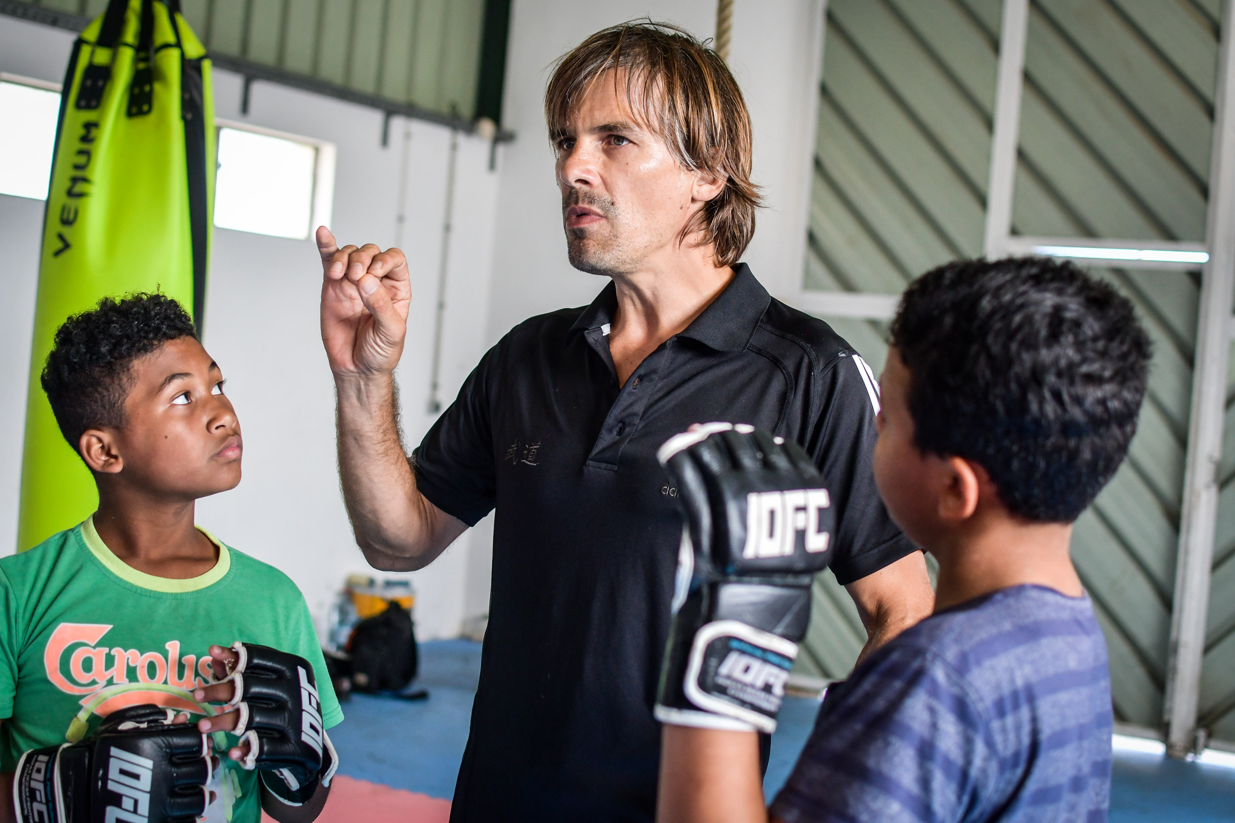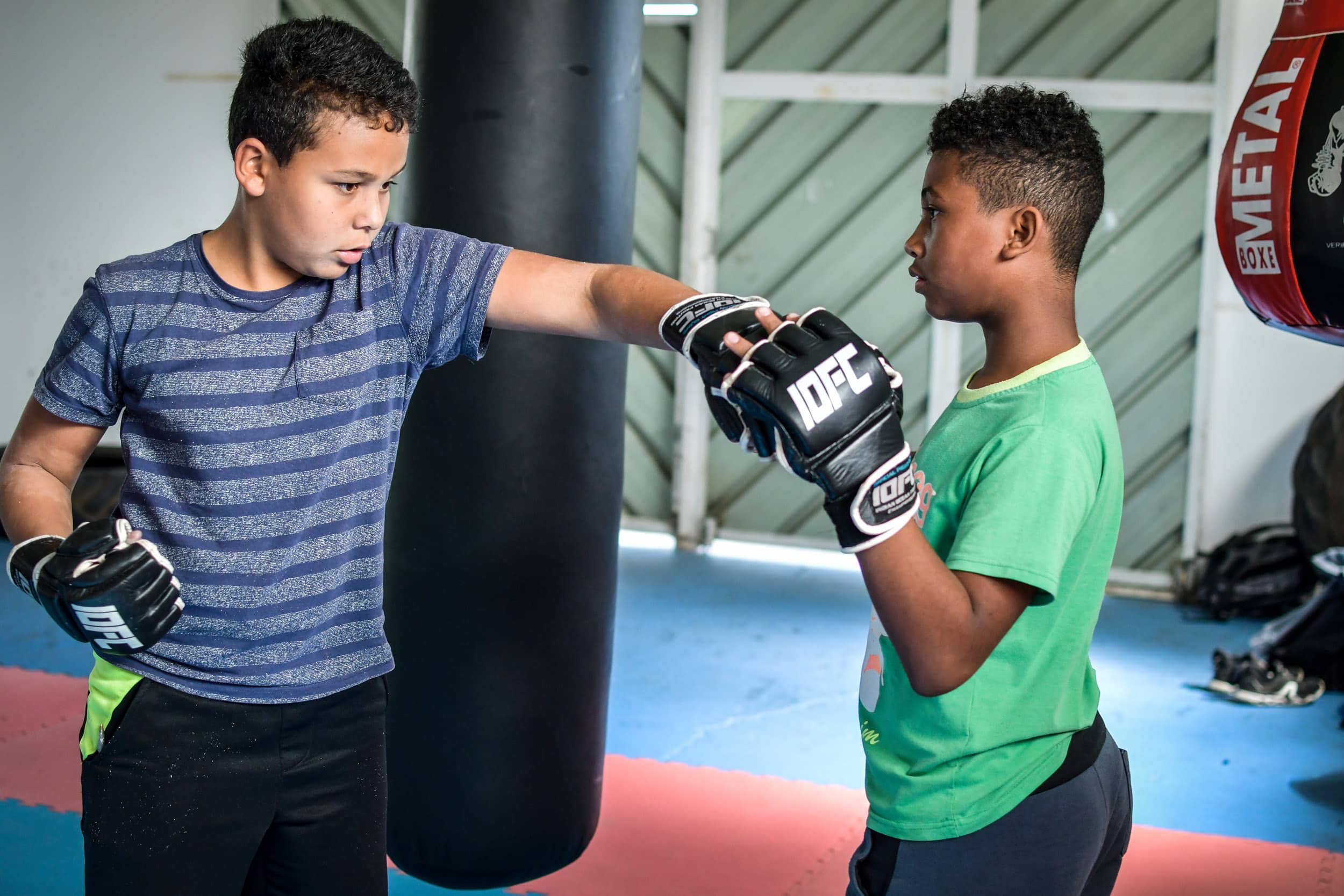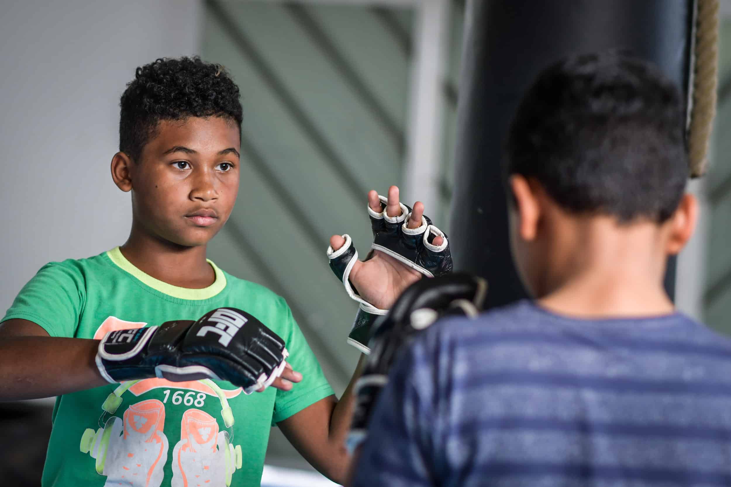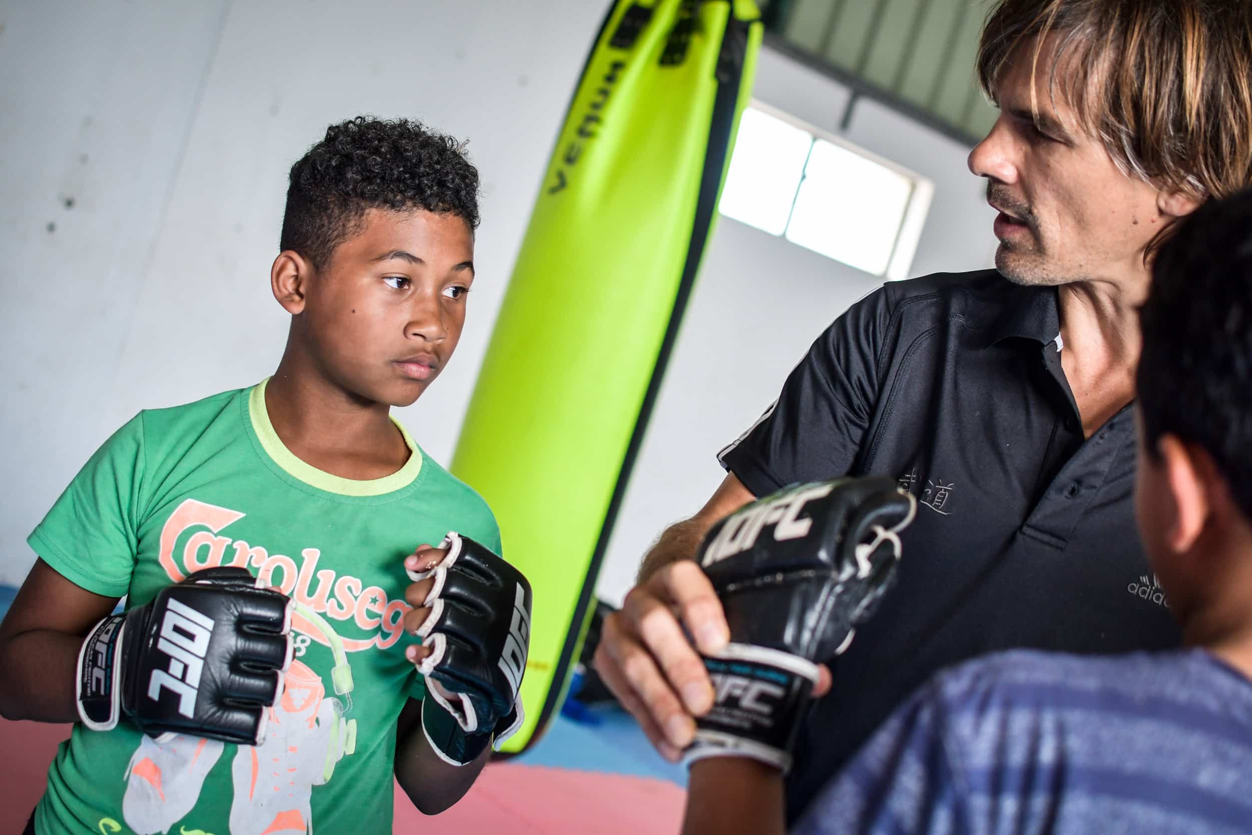 La particularité de cet atelier bi-hebdomadaire? L’enseignement dispensé. Passé les quelques exercices d’assouplissement initiaux empruntés au yoga, les marmailles enfilent rapidement les mitaines propres au MMA (Mixed Martial Arts), toujours interdit de compétition en France mais désormais décliné à un public toujours plus nombreux par des éducateurs certifiés. Et entament des percussions (uppercuts, directs, crochets…), des projections et des soumissions (clés de bras,…) empruntées à des disciplines aussi variées que la boxe anglaise, la lutte, le jiu-jitsu ou le pancrace.