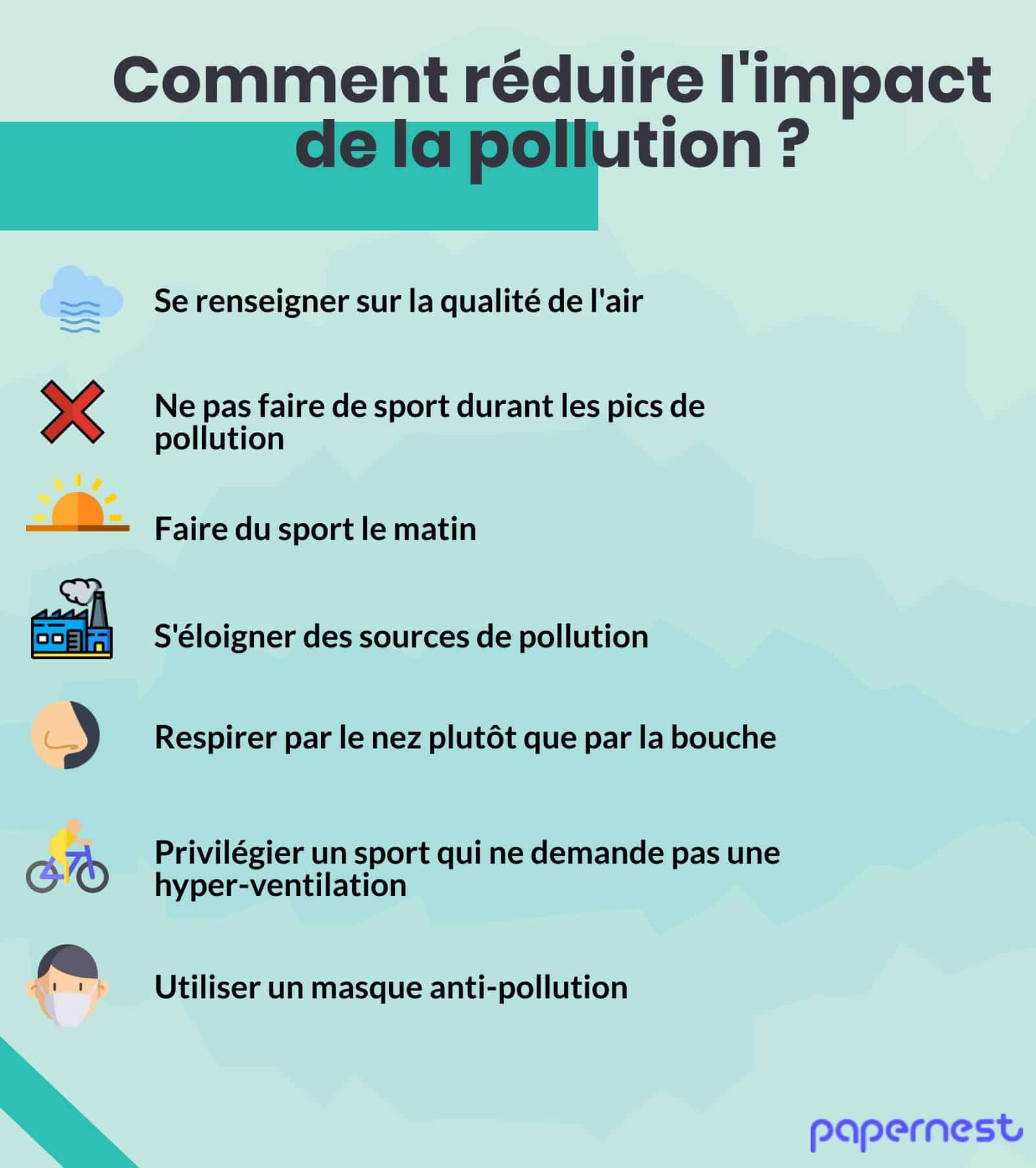 Pour continuer à pratiquer une activité physique régulière, il faut mettre en place des habitudes qui vont permettre de diminuer l’impact de la pollution sur l’organisme :