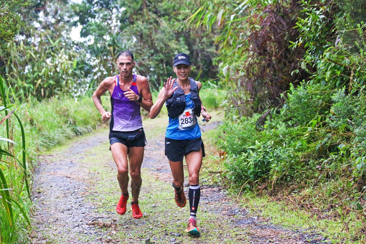 D’ombres et de lumières à travers le brouillard et les sentiers escarpés, le lyonnais s’est senti à l’aise en maitrisant la chevauchée fantastique, dans un rythme soutenu, là il a réussi à décrocher le Malgache Andrianirina rivosoa hobilalaina. Réussissant à développer en imposant son tempo dans un fluidité de cadence. Les jeux étaient faits au sommet (Point le plus haut (Piton Bois Vert-Foc Foc ) Alt 2255 m au Pk 15 ). Derrière les coups d’accordéon que se donnaient Mamy et Théo Robert s’entrechoquaient dans les racines de la forêt de la descente Jacques Payet là où Tibère avait déjà pris les commandes 2:03:04.00 et se devait d’assurer une bonne descente.