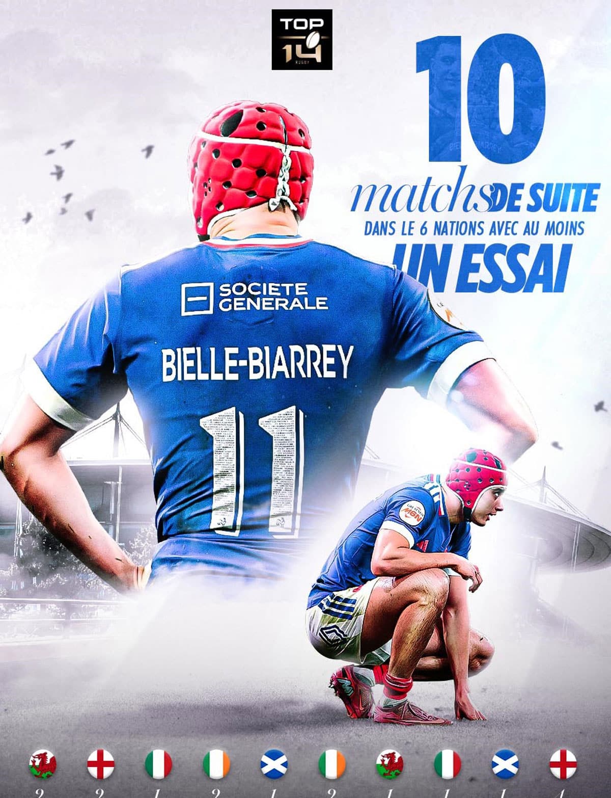 Auteur d’un tournoi exceptionnel, Louis Bielle-Biarrey a marqué l’histoire du Tournoi des Six Nations 2026. L’ailier tricolore a inscrit neuf essais lors de cette édition, battant son propre record établi l’an dernier (8). Il a également trouvé l’en-but lors des cinq rencontres du tournoi, une performance rarissime réalisée seulement par Philippe Bernat-Salles en 2001, Tommy Freeman en 2025 et lui-même lors de l’édition précédente. Face à l’Angleterre, le phénomène tricolore a franchi un nouveau cap en inscrivant un quadruplé – une première pour lui sous le maillot bleu – devenant seulement le deuxième joueur à réussir un tel exploit dans l’ère du Six Nations après Chris Ashton en 2011. Avec désormais 29 essais en 27 sélections, et 18 réalisations dans le Tournoi, il dépasse même Damian Penaud au classement des meilleurs marqueurs français depuis le passage au Six Nations, malgré deux fois moins de matches disputés.