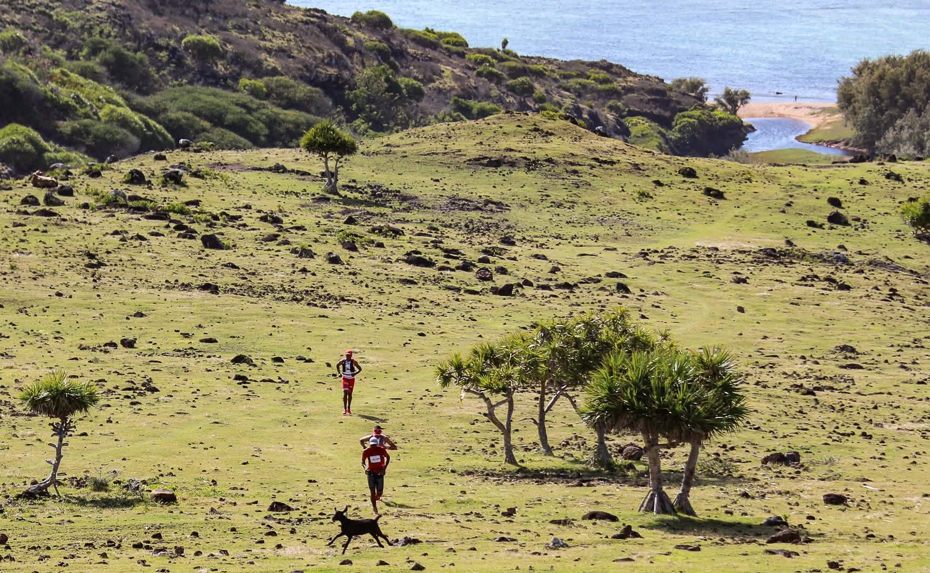 La veille du départ à 2 h 30 réserve Leguat, j’ai du mal à trouver le sommeil. A tue tête, un coq chante à toute heure, comme pour me dire d’y aller, ou qu’il vient avec moi changer sa condition de civet à pattes ; je ne ferai pas le coq sur cette course qui peut griller les ailes… Dolorès et Son me conduisent au départ après m’avoir fait un petit-déjeuner pantagruélique, ce qui imposera une entame calme avec une bonne charge en carburant pour plus tard. Avant l’envol, cadre salon de thé, sans séga-tambour. Puis ça file vite la nuit jusqu’à Mourouk dans une ambiance de piste aux étoiles ; j’essaie de ne pas trop dépasser les 10 km/h ; aucun souci si ce n’est quelques chiens grincheux… De là, on fait des ricochets en bord de mer au gré de belles criques et allées de filaos. À partir de Pointe Roche Noire, on attaque les falaises, et ça devient plus varié… Aborder Baladirou n’est pas une simple balade, par un long passage technique entre pièges de basalte et corail, et l’on n’est pas mécontent après un Nième petit coup de cul en escalier qui hisse au ravito, de retrouver un peu de goudron… La capitale Port Mathurin est vite atteinte, cependant que mon mode Pac-Man automatique est enclenché, et je ne me rends même pas compte d’avoir doublé de bons coureurs, tel Ronny Roussety, qui me le diront à l’arrivée. C’est le nord qui exigera le plus d’efforts, pas à cause de la survenue d’une ardeur du ciel que je tolère très bien, mais de tout ce qui fait de ce Hibou un trail pas si « roulant » que ça : rugueux rivages, ravines profondes qui imposent d’incessantes relances, pistes poussiéreuses, bandes herbeuses, ornières, dévers, tourbes, épais tapis de feuilles mortes qui cachent de gros cailloux, caps rocheux, galets instables, glissants récifs, sables fins où l’on s’enfonce, gros graviers, vases poisseuses et à trous de crabes – du gentil C’est-ma-faute au redoutable Trouloulou -, corail, croûtes de calcarénite, lames et pointes basaltiques comme autant de possibles croche-pieds, vieilles langues de lave en tapis pour fakirs qui s’étirent vers la mer, pierriers pour géants, et quelques perfides vagues qui viennent vous lécher les pieds, folles végétations dont ces opportunistes épineux « Piquants Loulou » – peste australienne gagnant du terrain depuis 1975 -, salutaires mangroves – palétuviers importés vers 1980 -, envoûtements des criques sauvages… Avoir gardé des ressources pour ne pas « perdre le nord » ! L’Anse Nicolas passée, les parcours 52 et 75 km vont se séparer, laissant au Hibou un plus long vol pour atteindre l’arrivée après un ultime pointage tout au bout de Pointe Corail – le chantier du nouvel aéroport ayant été encore différé – avant de remonter dans la touffeur tropicale vers l’humaine chaude ambiance de la réserve Leguat retrouvée.