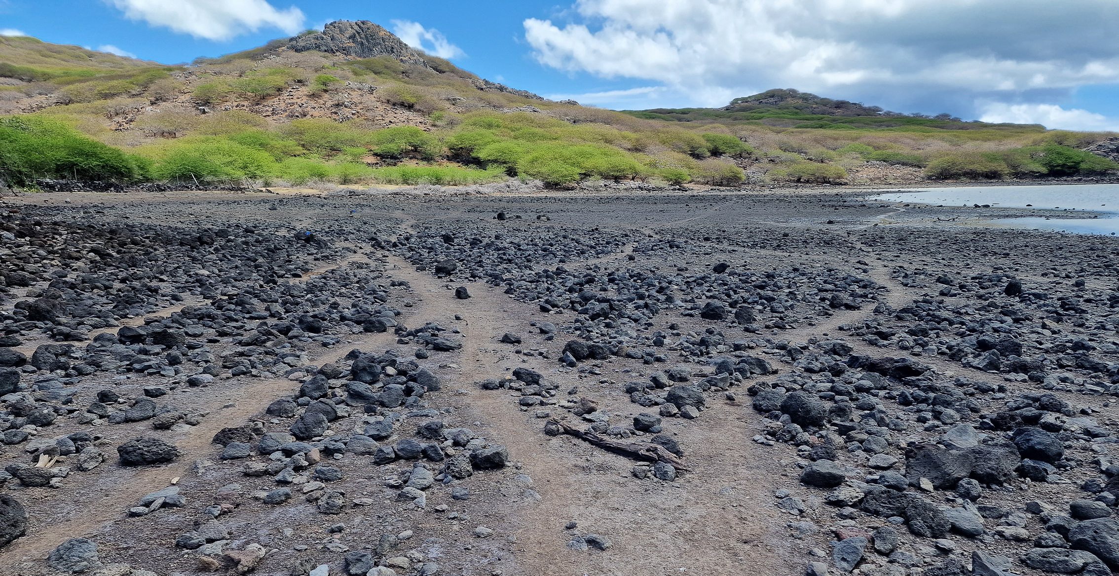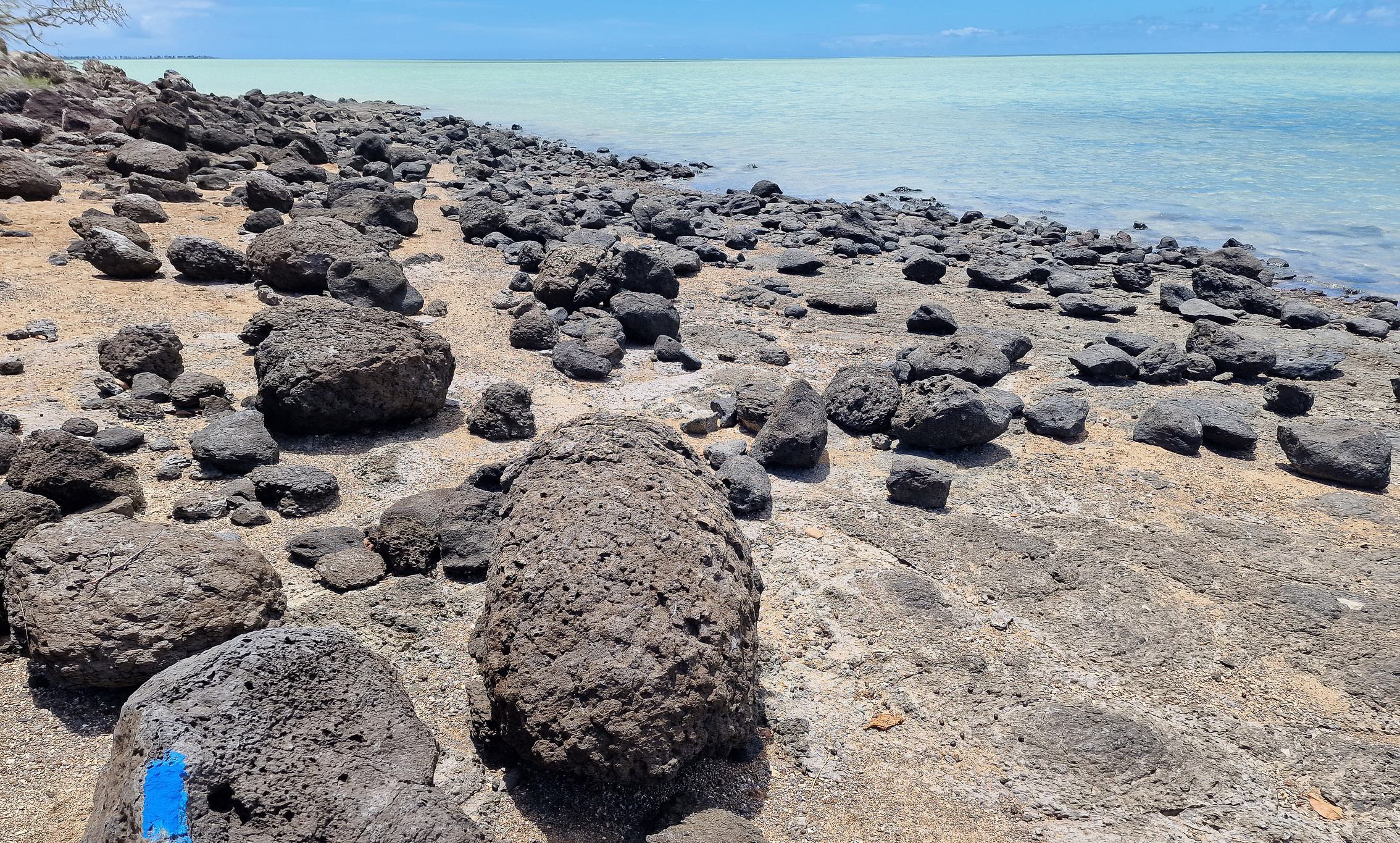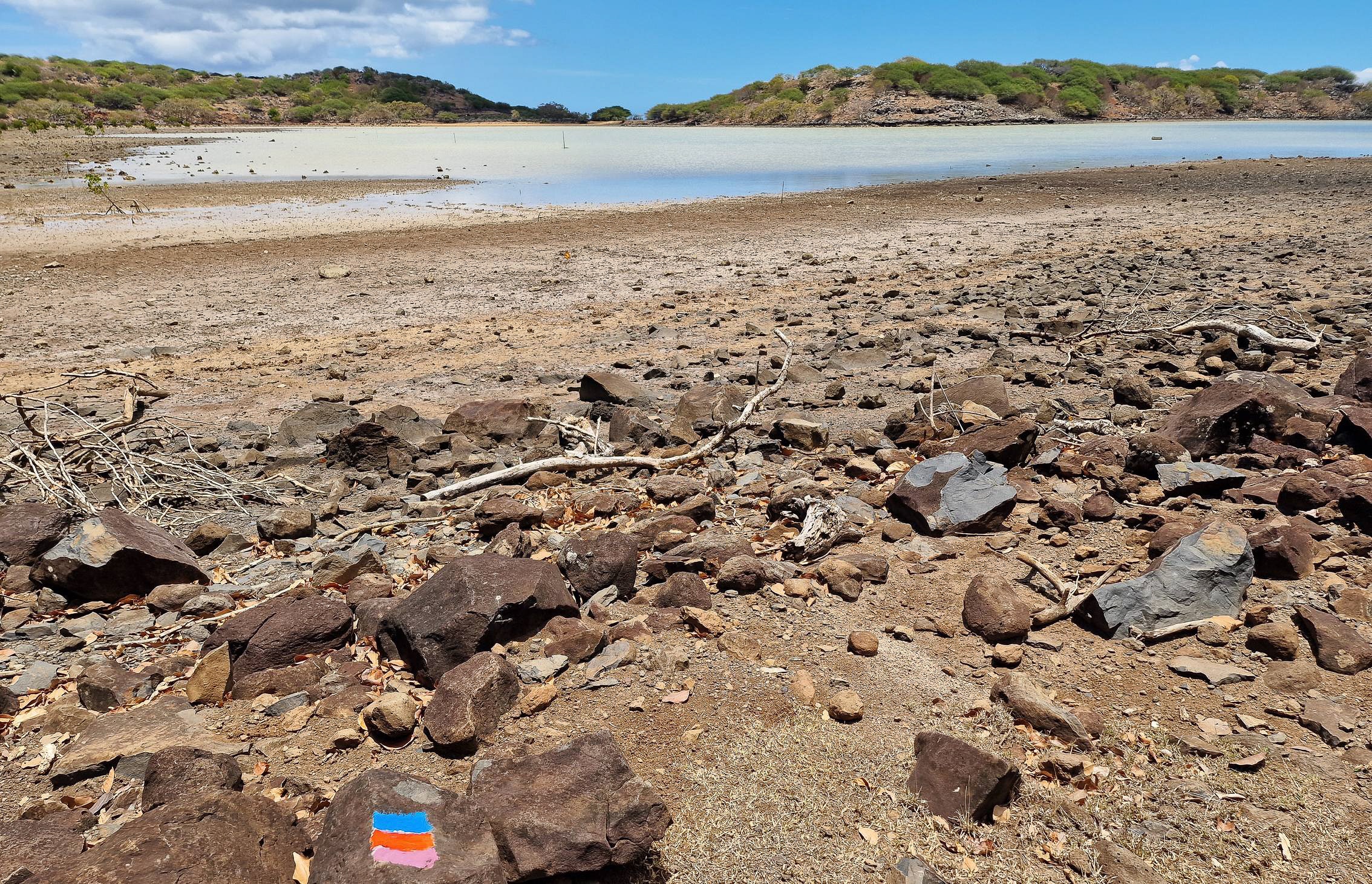 Jean Claude Ah-kang, alias Waro, termine souvent ses propos par sa formule d’amour pour le trail. Le Hibou doit suivre ses marques bleues. Entre ciel et mer, et même en passant par les façades des boutiques, cette couleur n’est pas ici la plus distinctive. Lors de mes 1ères courses du Hibou, ce fut une tâche obsédante de suivre les taches bleues. Connaissant désormais les subtilités du parcours, je peux libérer mon esprit pour d’autres observations. Cependant, après Baie du Nord, Waro s’est rappelé à moi par une œuvre singulière, le garagiste fraîchement retraité étant devenu artiste : un cactus peint du bleu Yves Klein, art éphémère d’un effet mer sur le vert. Et si j’étais le seul à en avoir fait une photo qui pourrait monter aux enchères chez Larry Gagosian ! Je sais les pros moins fidèles aux taches de Waro pour gagner quelques centaines de mètre, en traçant droit dans les estuaires, ce qui peut donner 74 et quelques au lieu des 75 km, et une amélioration du chrono en évitant des pièges techniques dessinés par Waro. Des membres de l’orga disent : tant qu’on a les points bleus en vue, on ne triche pas…
